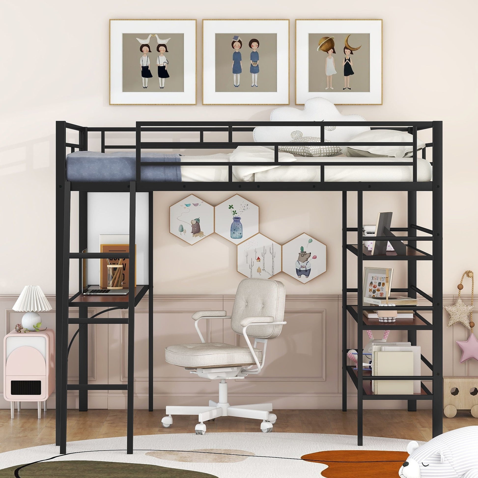 Full Size Loft Bed With 3 Layers Of Shelves And Desk, Stylish Frame Bed - Black