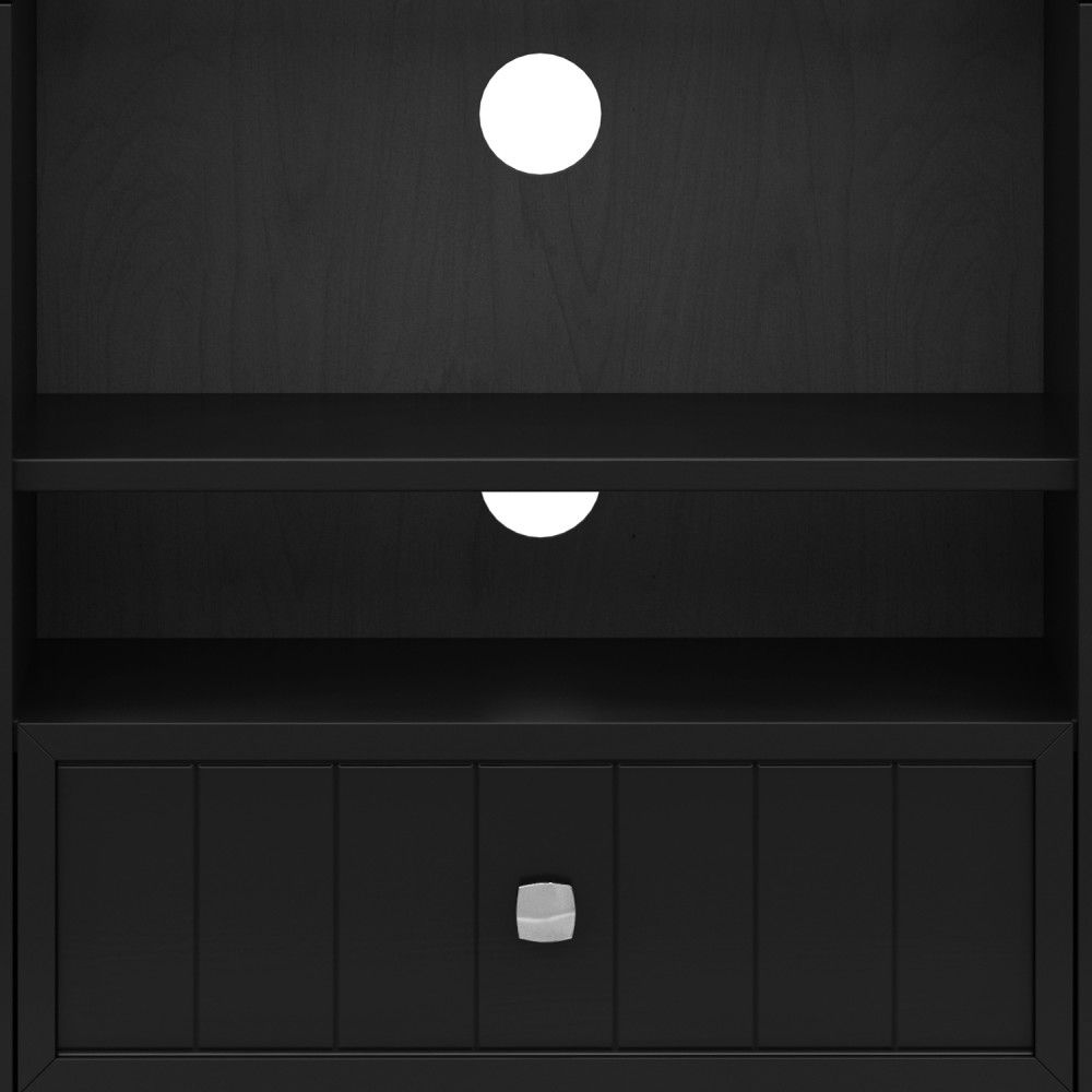 - Features two (2) central drawers with metal glides, open center area with adjustable shelf and two (2) side doors that open to large storage spaces with two (2) shelves each