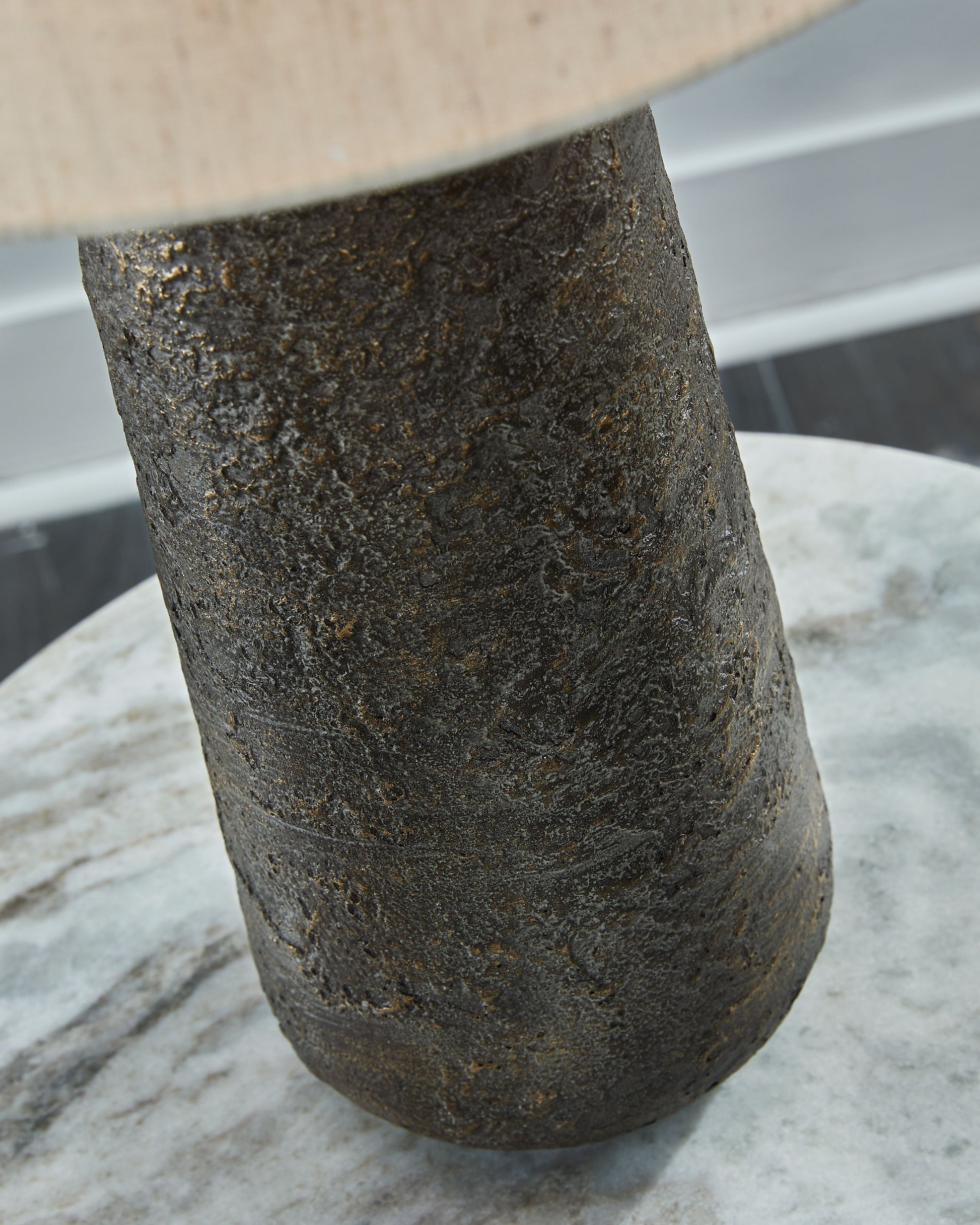 Modern industrial design in a new light. A mixed-media masterpiece, this table lamp with its heavily textured surface provides maximum interest and exceptional versatility. Whether resting on your nightstand or set on a side table, it delivers a cheerful aesthetic to your casual space.