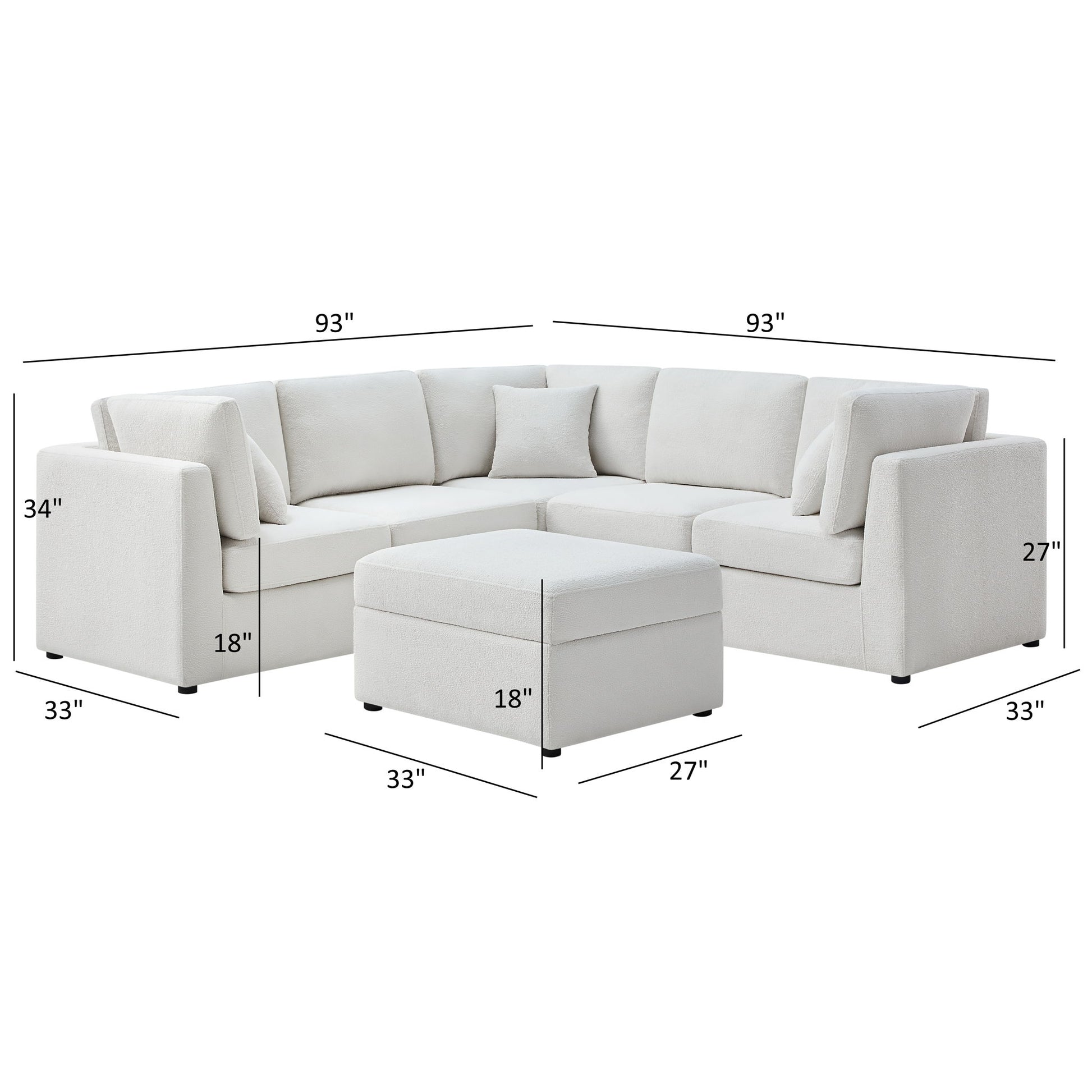 - Modular Design: Flexible layout with corner wedges, armless chairs, and storage ottoman for personalized space configuration