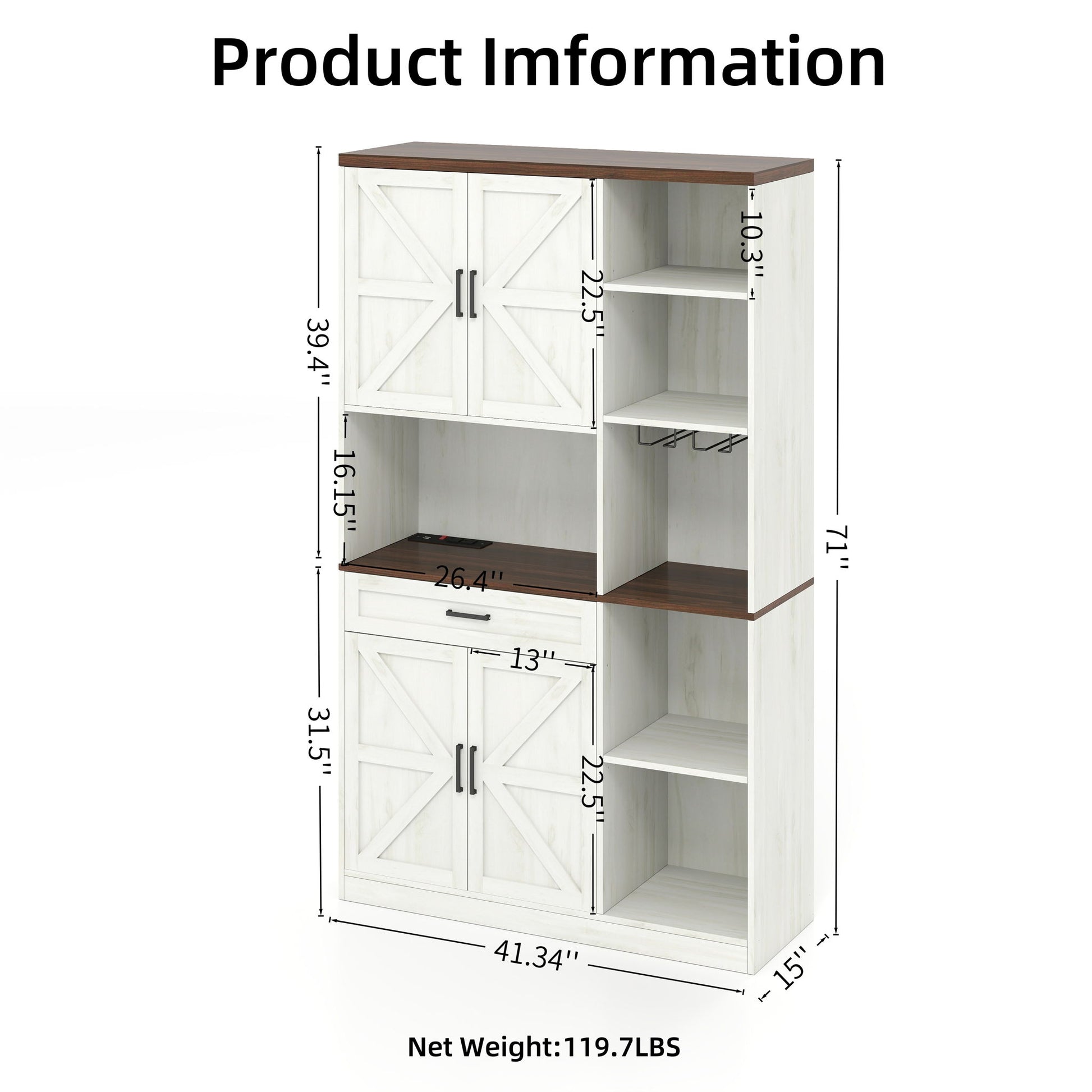 Farmhouse Kitchen Pantry Sideboard With Cabinet And Drawer, Multi Functional Kitchen Buffet With Hutch And Glass Holder, Microwave Stand With Charging Station - Brown / Antique White