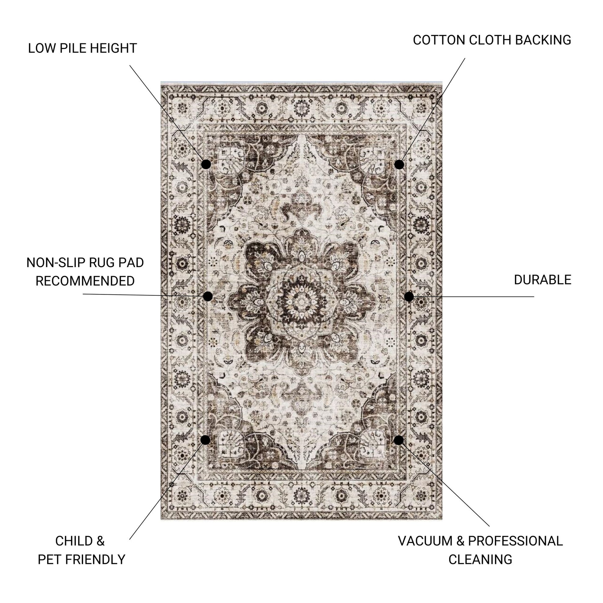 - Durable and Family-Friendly: Crafted with durable materials, this rug is designed to withstand high traffic areas, making it ideal for families with kids and pets. The polyester pile yarn and polyester-cotton backing ensure longevity and resilience.