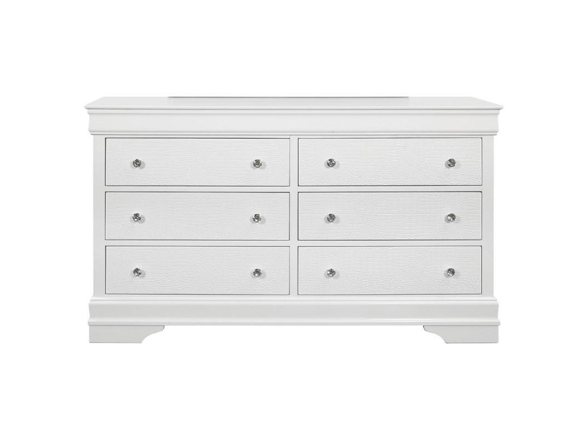 GLOBAL Pompei 6 Drawer Dresser with Crystal Drawer Knobs, Spacious Drawers, French Dovetail Box, Textured Detail, Color: Metallic White