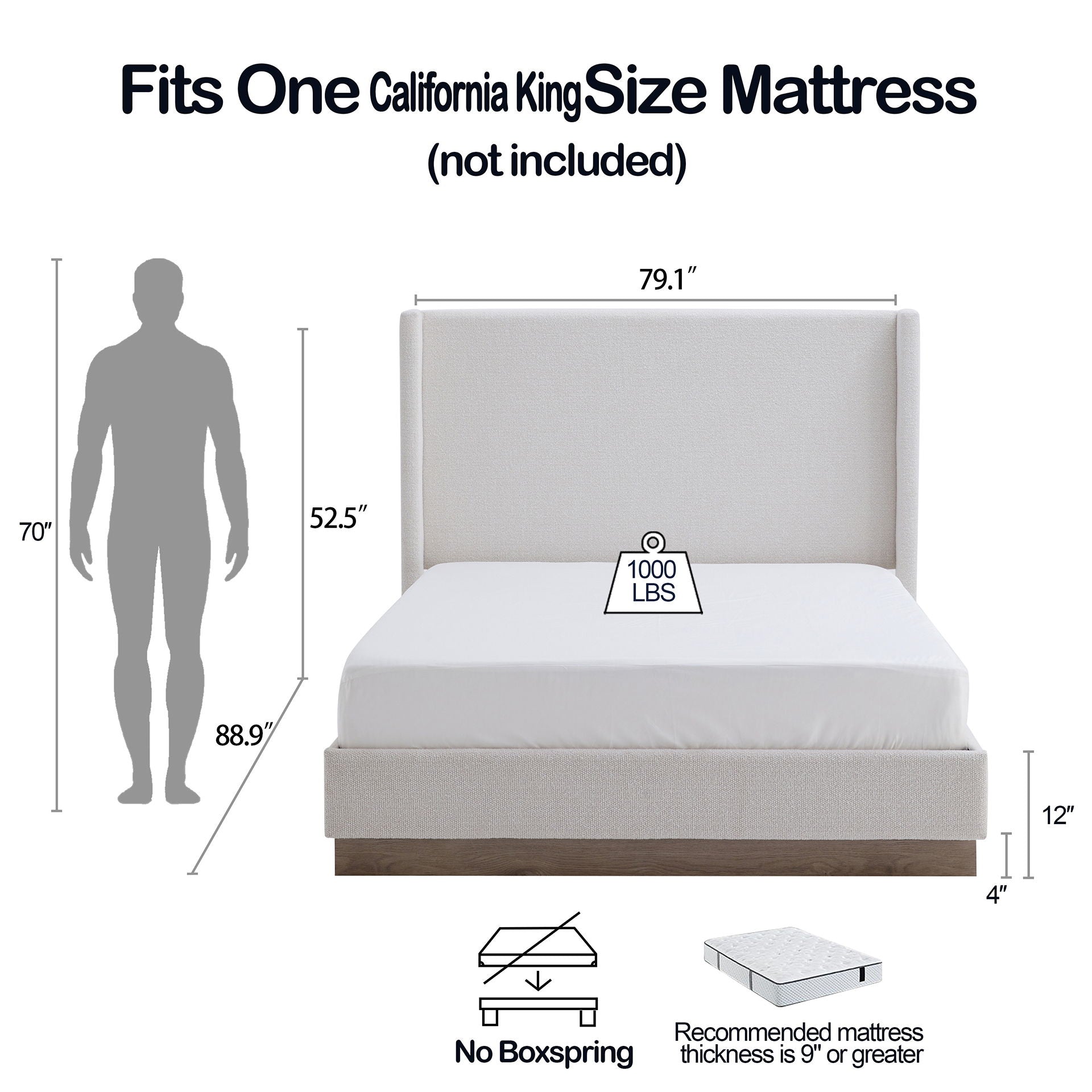 Hosford - California King Minimalist Upholstered Boucle Wingback Bed - Cream White / Light Gray / Camel Oak