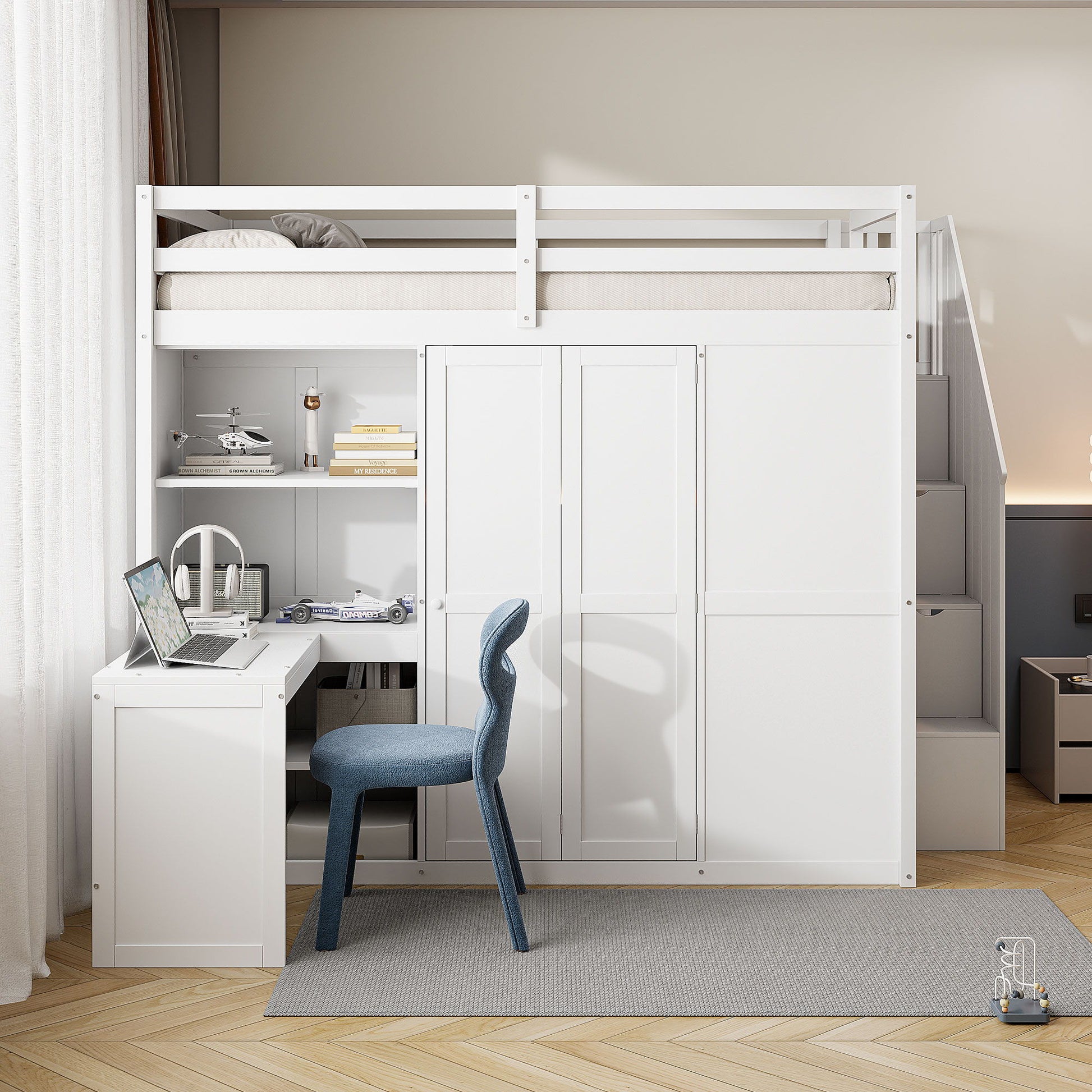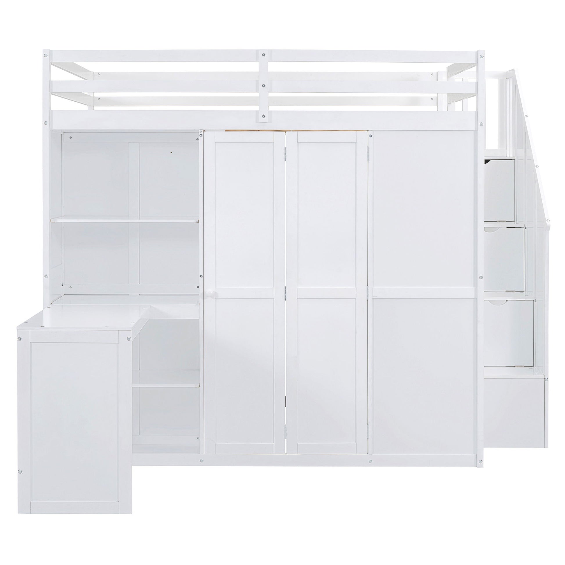 Full Size Loft Bed With Wardrobe, Desk And Shelves - White