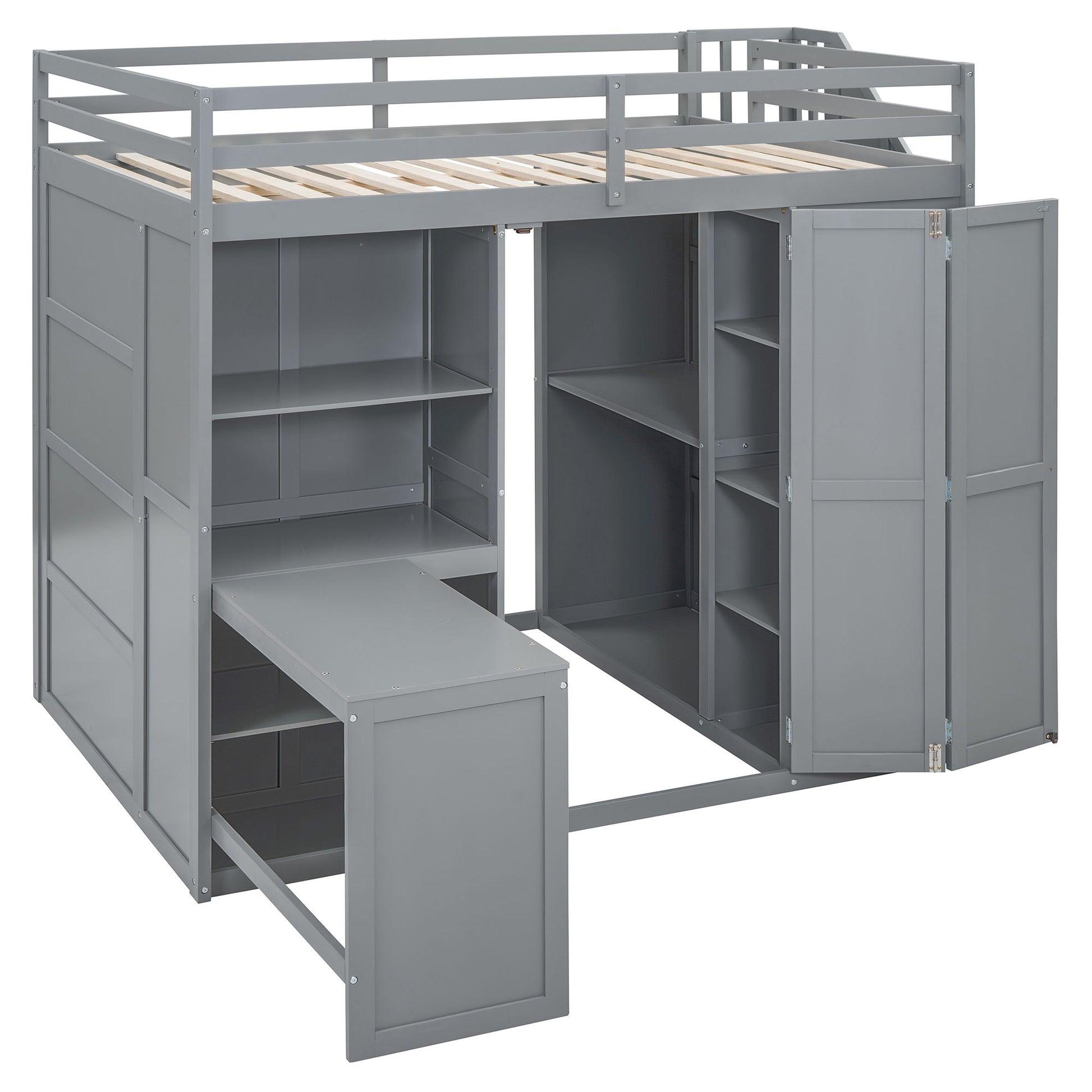 Full Size Loft Bed With Wardrobe, Desk And Shelves - Gray