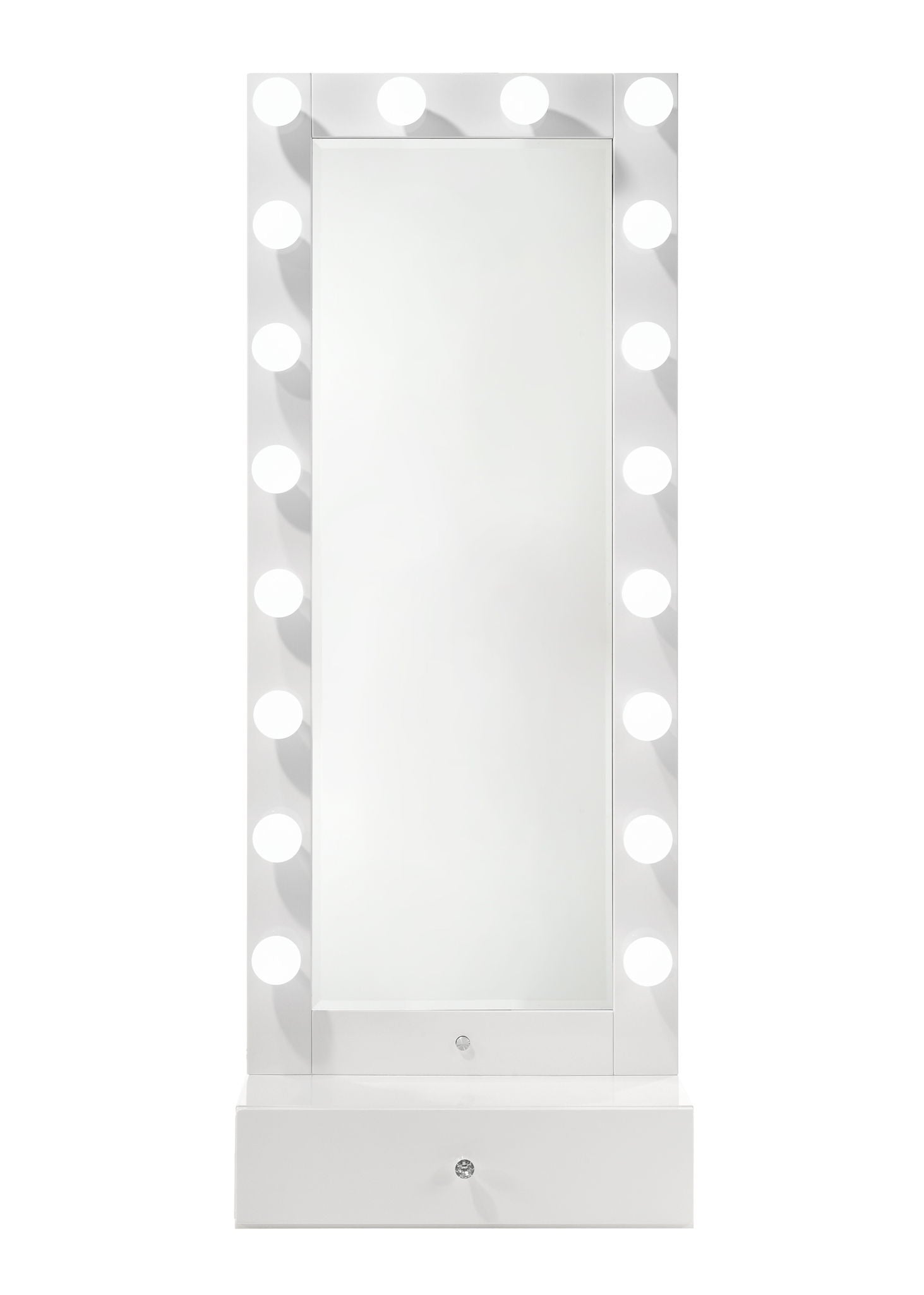 Step into a world of glamour with this sleek and chic vanity set, a perfect fusion of functionality and fashion. Its glossy white finish and clean lines are complemented by the sparkle of a crystal-like knob, adding a touch of sophistication to your personal space. The full length mirror is surrounded by radiant lights, while the ample drawer provides storage for essentials. A perfect spot to check your outfit of the day.