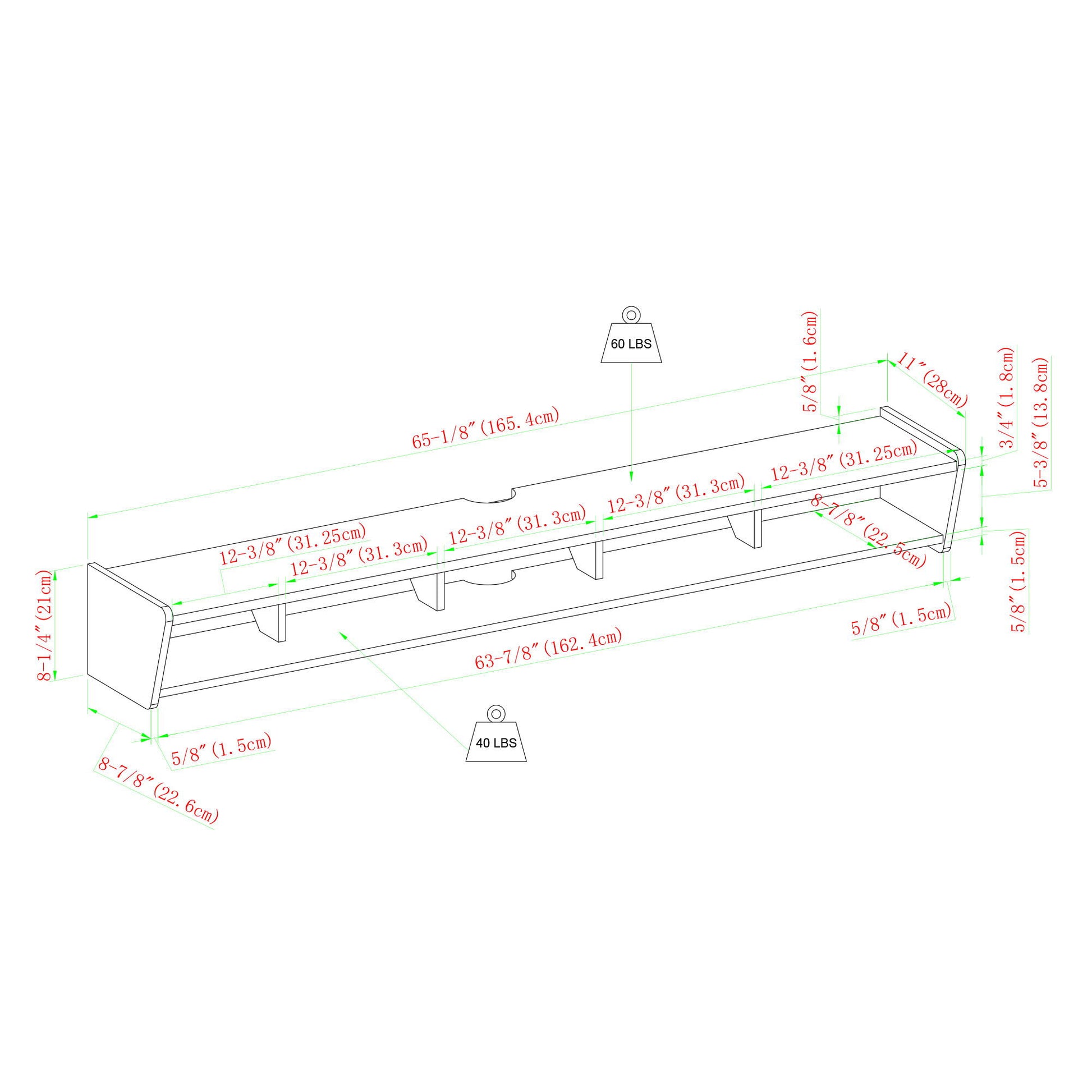 65.13"W x 11.0"D x 8.25"H - 29.0 lb