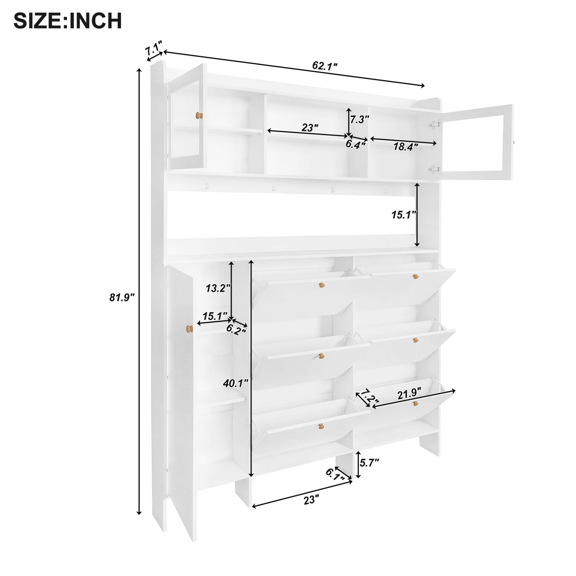 Multifunctional Tipping Bucket Shoe Cabinet With Storage Shelf & 6 Flip Drawers, Large Hall Tree With Tempered Glass Doors, Foyer Cabinet With 4 Hooks For Hallway - White