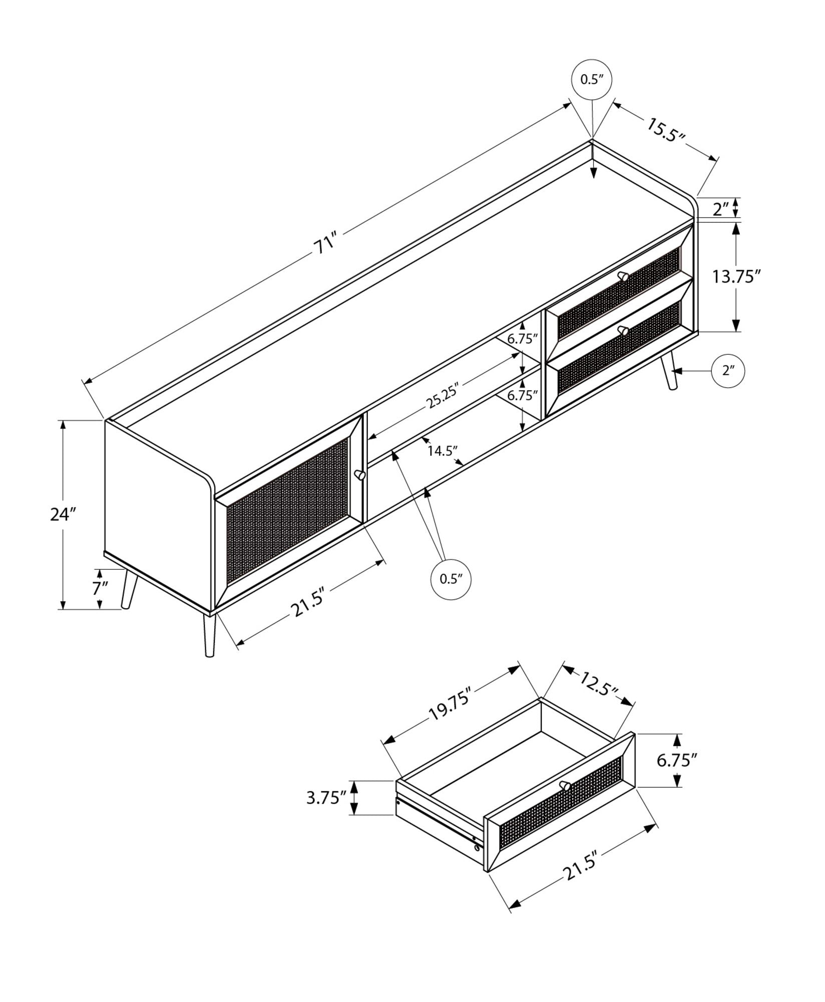 71.0"W x 15.5"D x 20.75"H - 62.0 lb